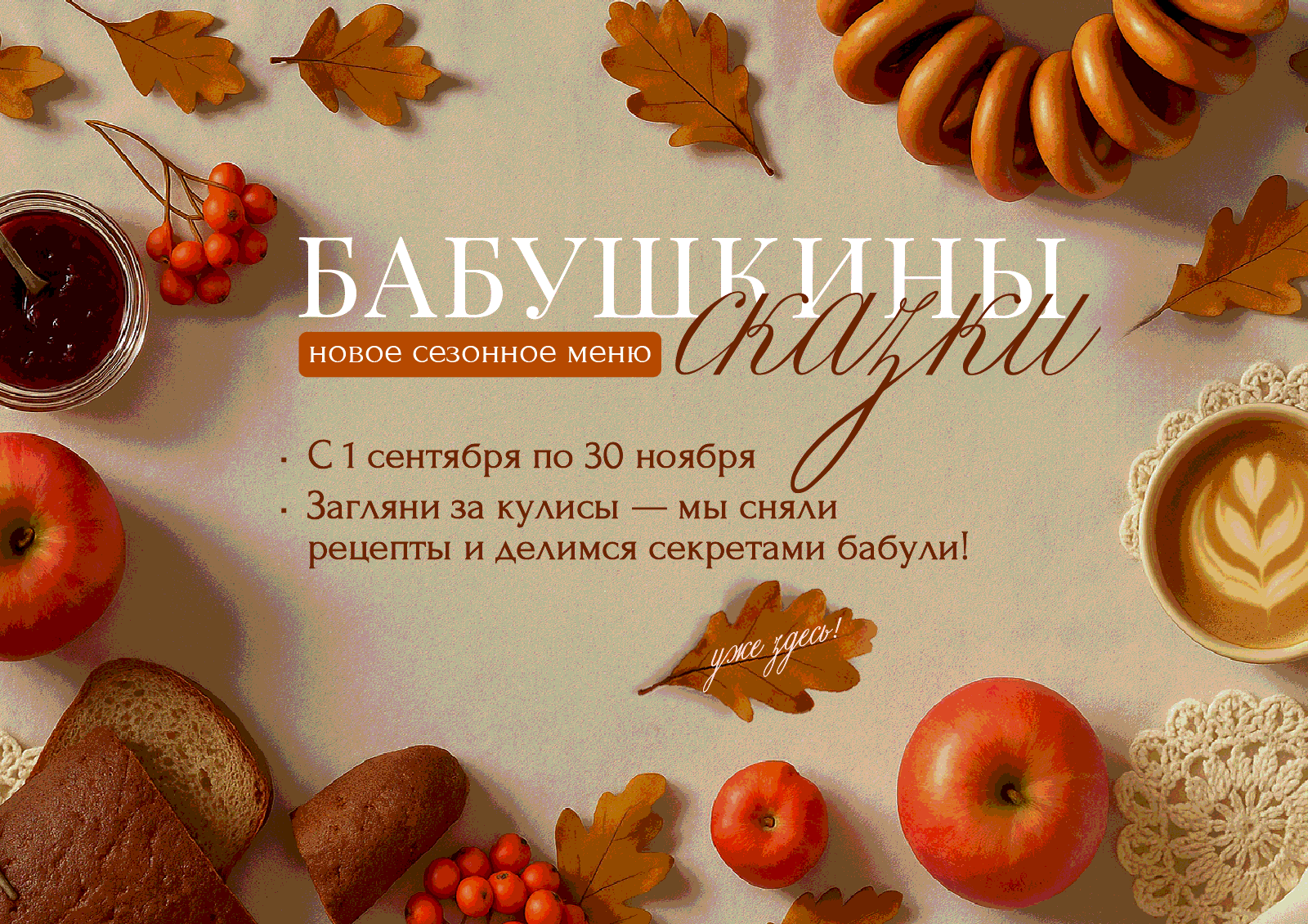Попробуйте приготовить бабушкины рецепты малинового пирога и маринованных огурцов прямо у себя дома, создавая атмосферу осени и уюта. А для идеального дополнения к этим угощениям загляните в наши кофейни, где с 1 сентября по 30 ноября вас ждут напитки, вдохновленные этими осенними вкусами.